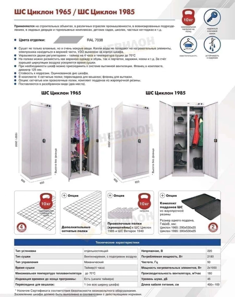 Шкаф сушильный Практик ШС Циклон 1965 — идеальное решение для сушки верхней одежды и обуви. Этот металлический шкаф, благодаря электрической системе, подходит для использования в самых разных условиях: от строительных площадок до детских садов. Его размеры 1950x650x600 мм и вес 58 кг делают его компромиссным вариантом как для домашних нужд, так и для профессионального использования.