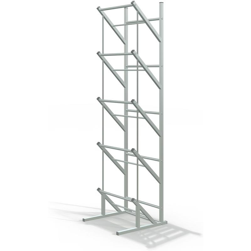 Полки стеллажа расположены под оптимальным углом, что облегчает размещение и извлечение бутылей. Кроме того, стеллаж оснащён подпятниками, которые предотвращают повреждение напольного покрытия при перемещении и гарантируют устойчивость конструкции.