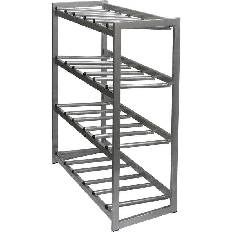 Полки стеллажа расположены под оптимальным углом, что облегчает размещение и извлечение бутылей. Кроме того, стеллаж оснащён подпятниками, которые предотвращают повреждение напольного покрытия при перемещении и гарантируют устойчивость конструкции.