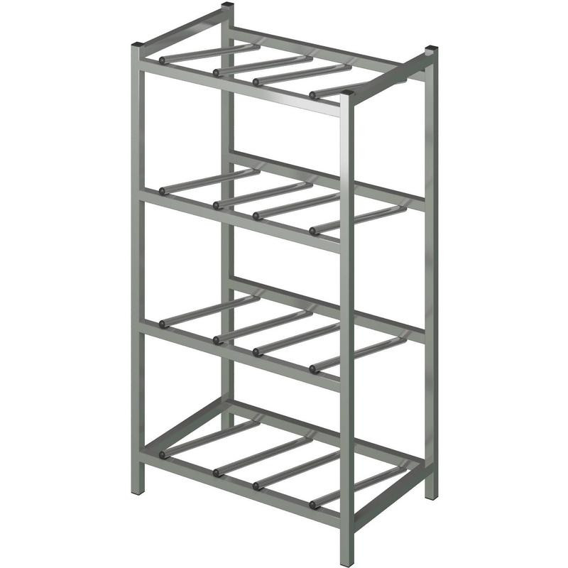 Полки стеллажа расположены под оптимальным углом, что облегчает размещение и извлечение бутылей. Кроме того, стеллаж оснащён подпятниками, которые предотвращают повреждение напольного покрытия при перемещении и гарантируют устойчивость конструкции.
