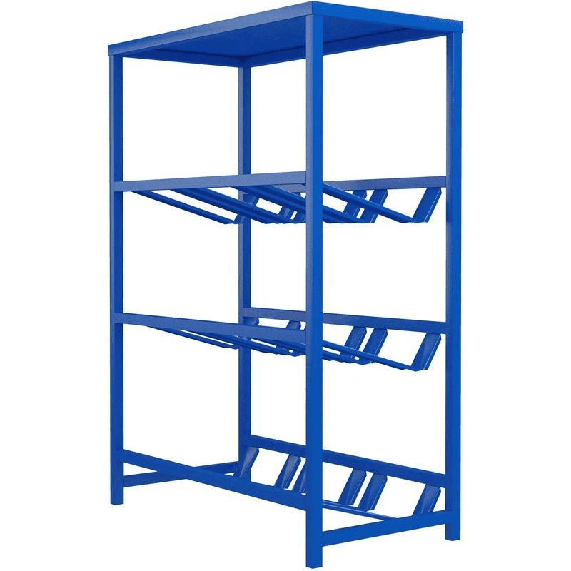 Полки стеллажа расположены под оптимальным углом, что облегчает размещение и извлечение бутылей. Кроме того, стеллаж оснащён подпятниками, которые предотвращают повреждение напольного покрытия при перемещении и гарантируют устойчивость конструкции.
