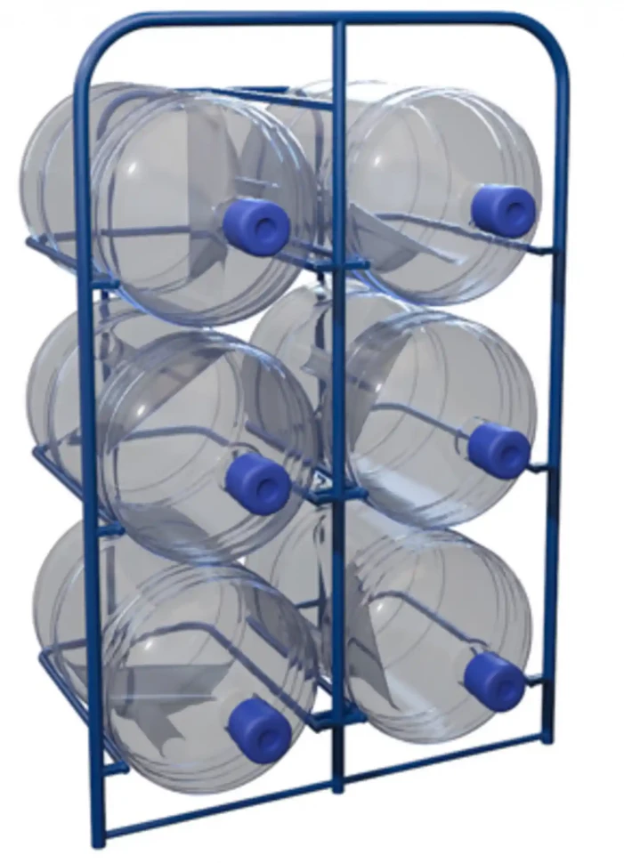 Стеллаж для бутылей питьевой воды СВД-6. Специализированный стеллаж разработан для оптимального хранения бутылей с питьевой водой объемом 19 литров. Конструкция позволяет разместить до 6 бутылей, обеспечивая их надежное хранение и удобный доступ. Идеальное решение для торговых помещений, офисных центров и складских зон.