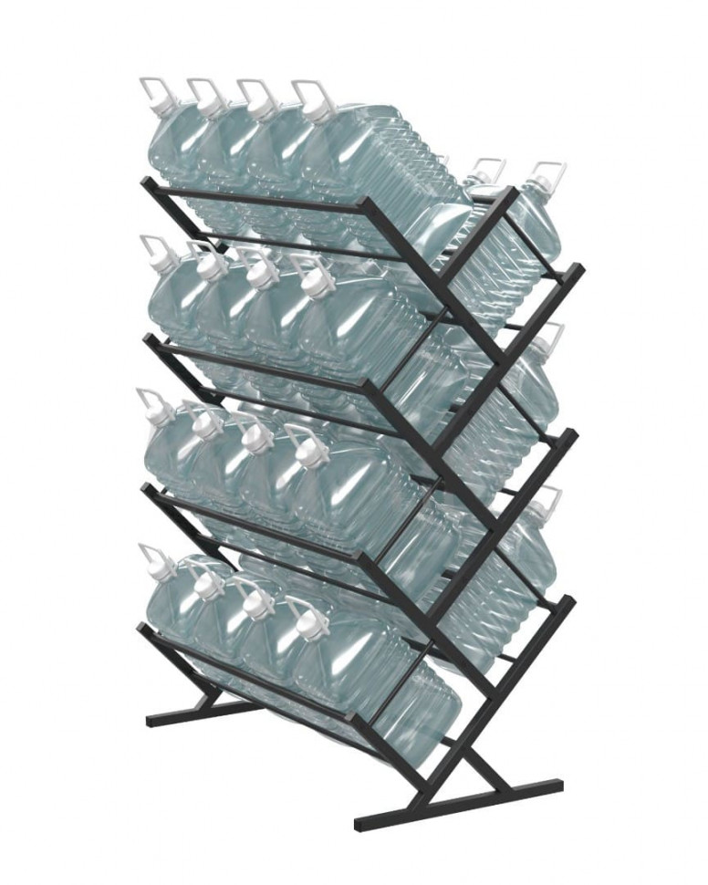 Металлический Двусторонний стеллаж для воды Стилс-28 на 28 бутылей 5/6 л, черный - идеальное решение для хранения бутилированной воды на 19 литров предлагает уникальную возможность установки бутылок с двух сторон, обеспечивая демонстрацию товара со всех сторон и экономию пространства. Оптимальный угол наклона полок гарантирует удобство размещения и извлечения бутылок. Благодаря подпятникам предотвращается повреждение напольного покрытия при перемещении стеллажа. Открытая конструкция основания стеллажа облегчает процесс уборки пола и обеспечивает хорошую вентиляцию, предотвращая образование плесени и грибка.