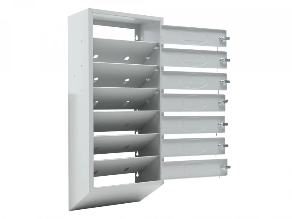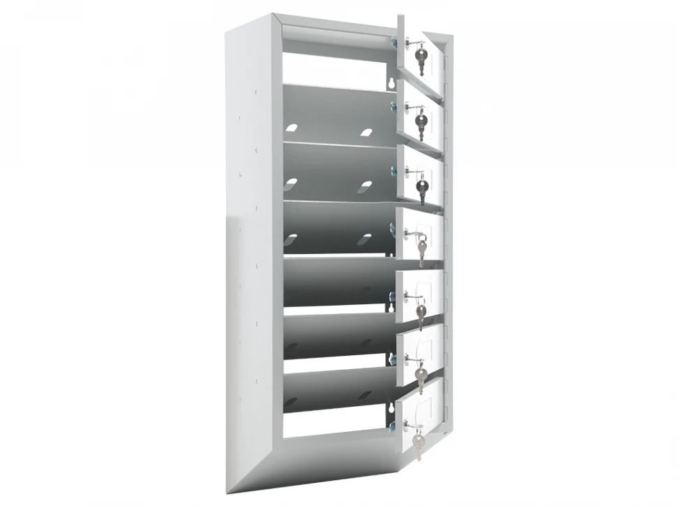 Параметр Значение Высота, мм 842 Ширина, мм 383 Глубина, мм 186 Вес: 8 кг Тип установки настенный Тип замка Ключевой Производство ПРАКТИК Цвет: светло серый Шагрень (RAL 7035) Тип покрытия: Порошковое Гарантия 1 год Количество дверей (секций) 7