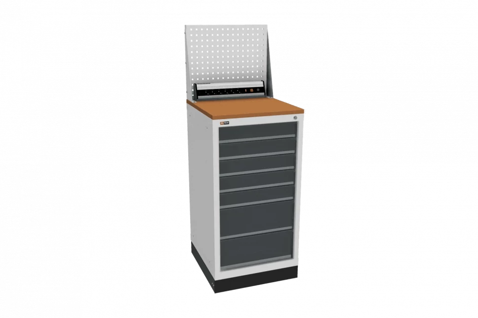 Параметр Значение Высота, мм 1595 Ширина, мм 565 Глубина, мм 600 Вес: 86.25 кг Назначение цоколя Выполняет защитную и эстетическую функцию Назначение подставок Для перемещения тумбы погрузчиком Мобильность Стационарные Шаг перфорации экрана 35 мм Система запирания Общая Тип дверей раздвижные Максимальная нагрузка 1500 кг Материал ящиков Металл Тип корпуса Сварной Толщина столешницы 24 мм Материал столешницы Фанера Гарантия 3 года Производство ДиКом Цвет: RAL 7038 (агатовый серый) , RAL 7016 (антрацитово-серый) Тип замка Ключевой Количество ящиков 7 Комплектация Корпус тумбы, 7 ящиков, столешница, экран, электропанель, подставки с цоколем Максимальная нагрузка на ящик, кг 60 Предназначены для гаража, мастерской, производства Модель ВЛ - Документация