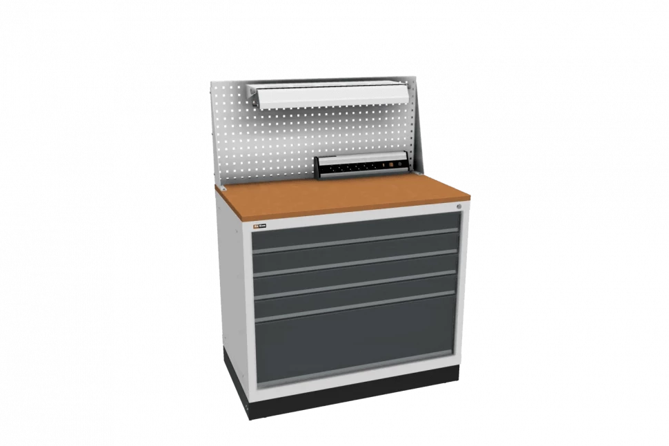 Параметр Значение Высота, мм 1395 Ширина, мм 1024 Глубина, мм 600 Вес: 102 кг Назначение цоколя Выполняет защитную и эстетическую функцию Выдвижение ящиков 100% Назначение подставок Для перемещения тумбы погрузчиком Мобильность Стационарные Шаг перфорации экрана 35 мм Система запирания Общая Тип дверей раздвижные Максимальная нагрузка 1500 кг Материал ящиков Металл Тип корпуса Сварной Толщина столешницы 24 мм Материал столешницы Фанера Гарантия 3 года Производство ДиКом Цвет: RAL 7038 (агатовый серый) , RAL 7016 (антрацитово-серый) Тип замка Ключевой Количество ящиков 5 Комплектация Корпус тумбы, 5 ящиков, столешница, экран с кронштейном и светодиодным светильником, электропанель, подставки с цоколем Максимальная нагрузка на ящик, кг 60 Предназначены для гаража, мастерской, производства Модель ВЛ - Документация