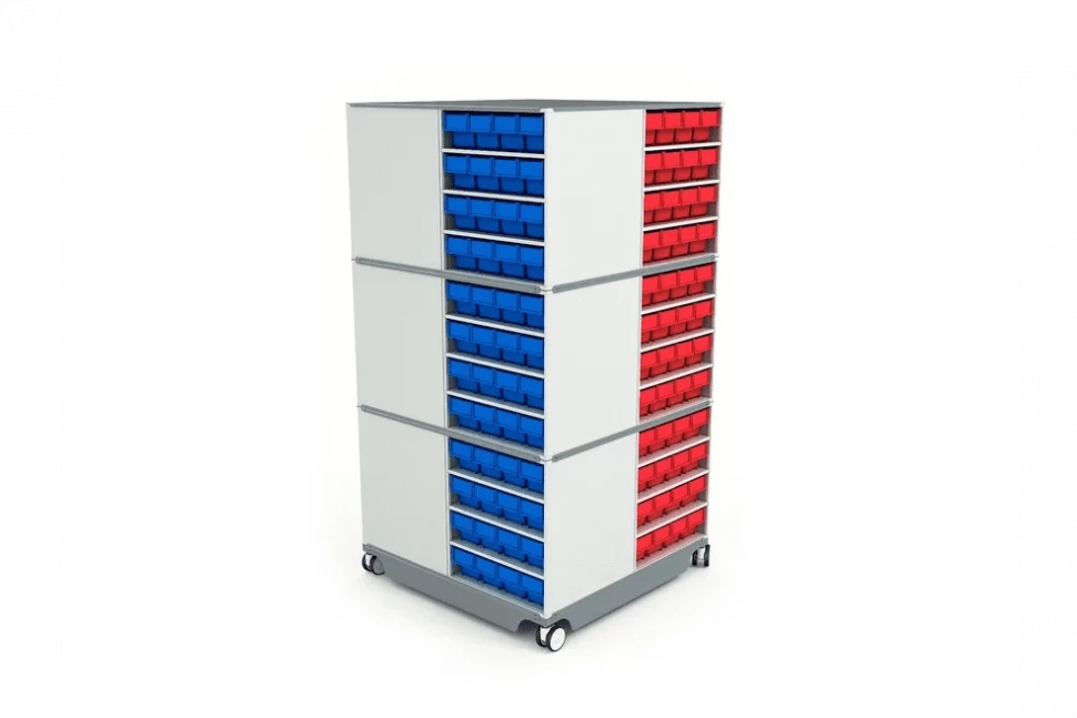 - 192 ящика из общепромышленного пластика обеспечивают достаточное пространство для хранения.
