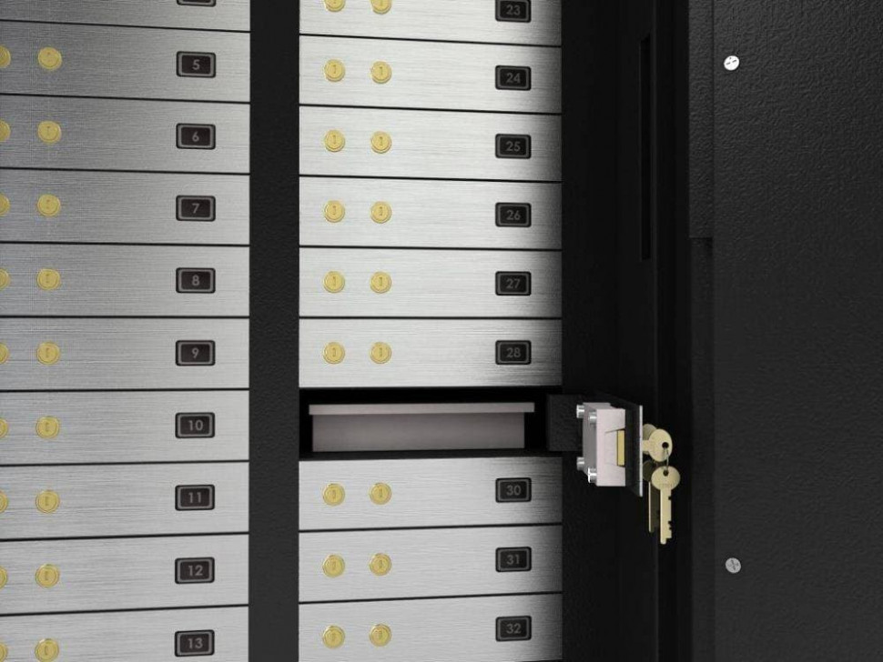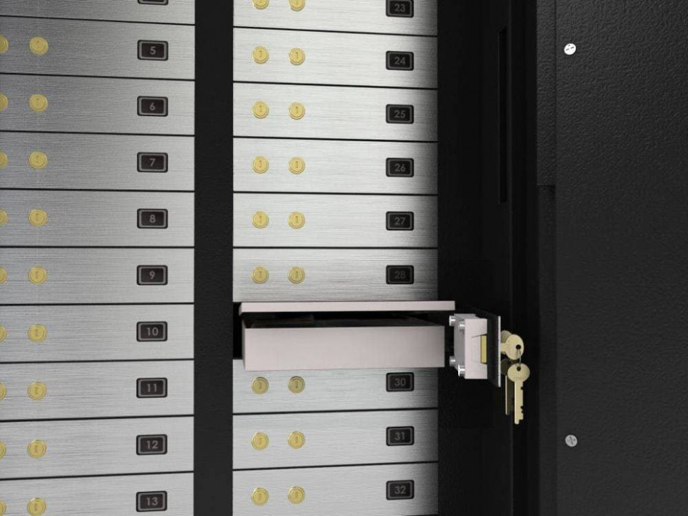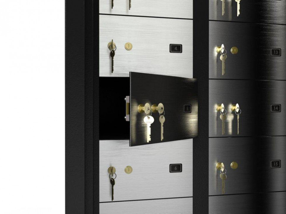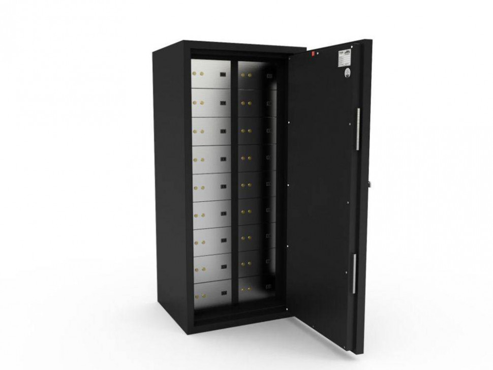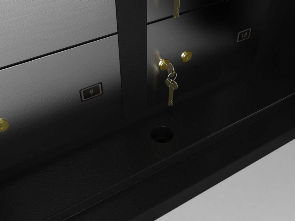 - Сейф оснащен 18 ячейками для удобного распределения ценностей, обеспечивая порядок и доступность.